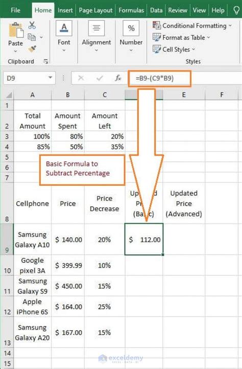how to subtract percentage in excel